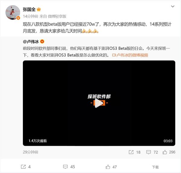 据了解,这次上线的澎湃 OS 3 Beta 版收获了良好的口碑,卢伟冰说"上次请大家吃东来顺,金凡没在,基于大家对澎湃 OS 3 Beta 版的反馈,金凡可以上桌了"。