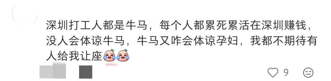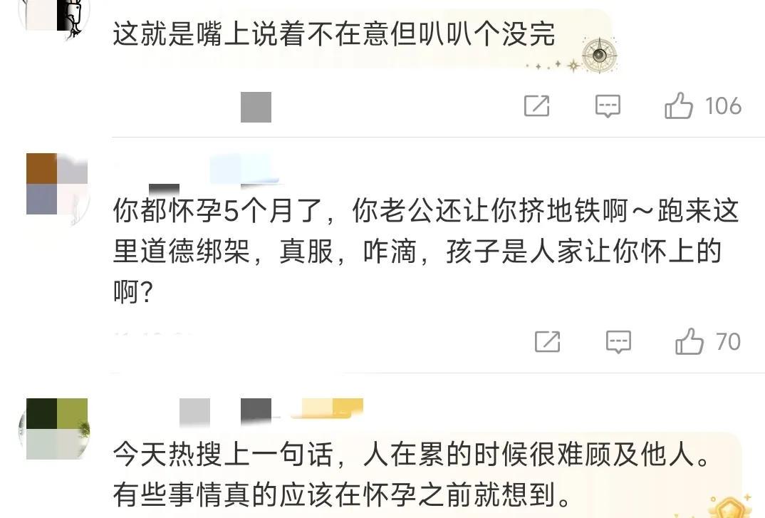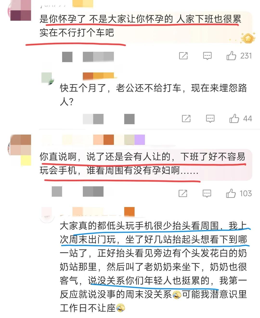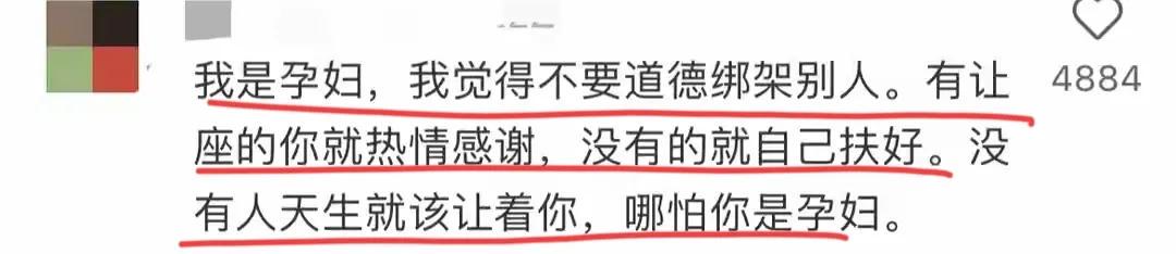 “是你自己怀孕的,又不是网友们让你怀的,关我们什么事!人家上下班不累吗?实在不行你不能打车吗?”“而且,你一个孕妇你有需求你就讲啊!你说出来基本上大家都会让的。现在大部分人下班之后都习惯性低头玩手机,真没心思注意周边环境。”