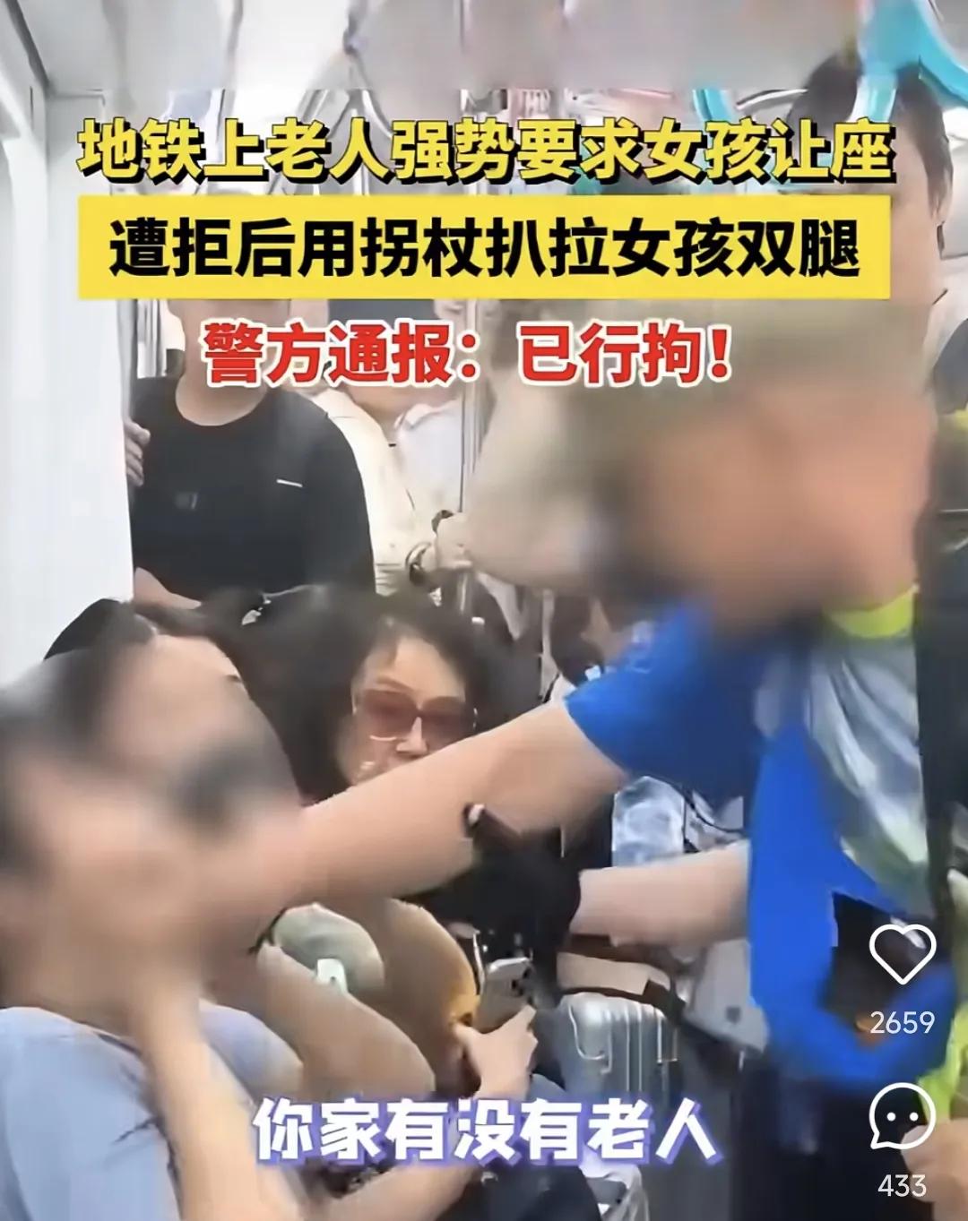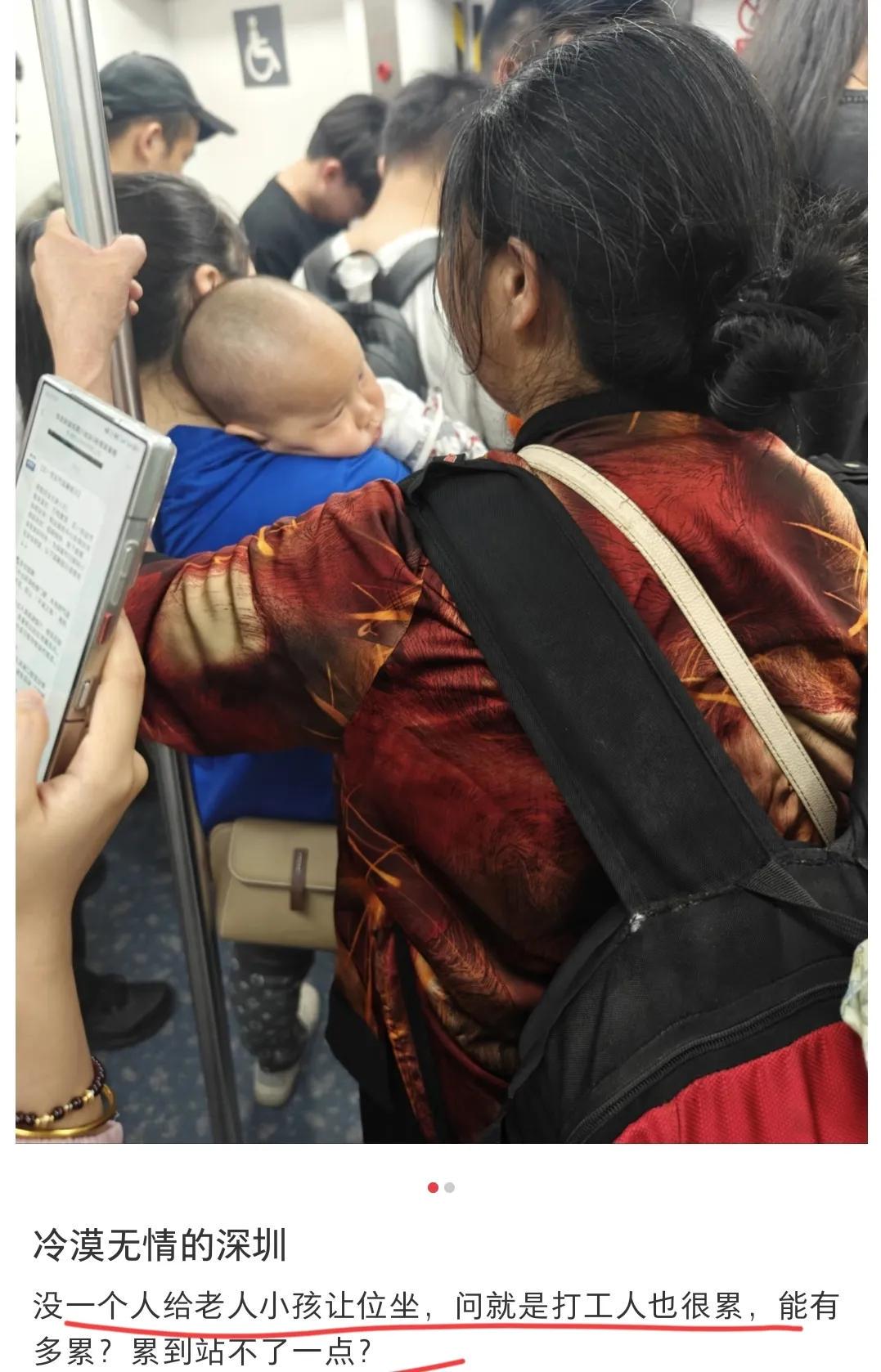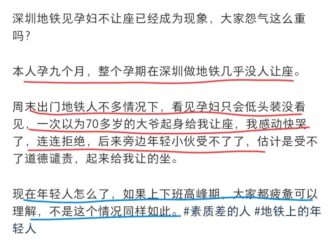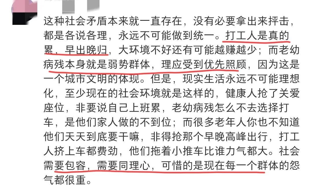 被挤到了或者找不到位置坐,就指责上了一天班恨不得倒在地上睡过去的打工人没有爱心,不给她们让座。