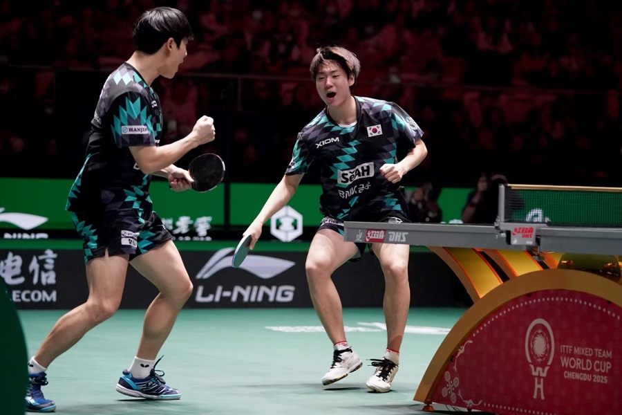 吴晙诚/朴康贤2比0战胜多哈世乒赛男双亚军组合林昀儒/高承睿,助韩国队取胜
