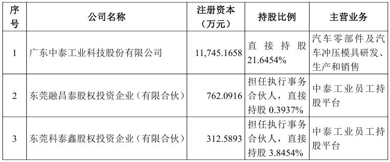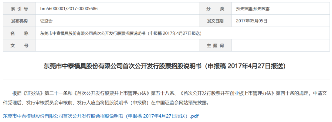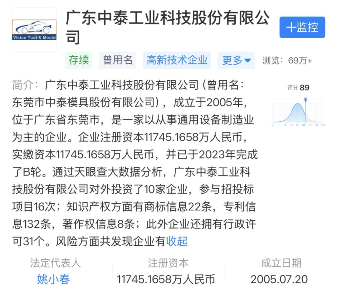 公开信息显示,广东中泰工业科技股份有限公司曾用名东莞市中泰模具股份有限公司,在2017年曾申报深交所IPO,之后终止。