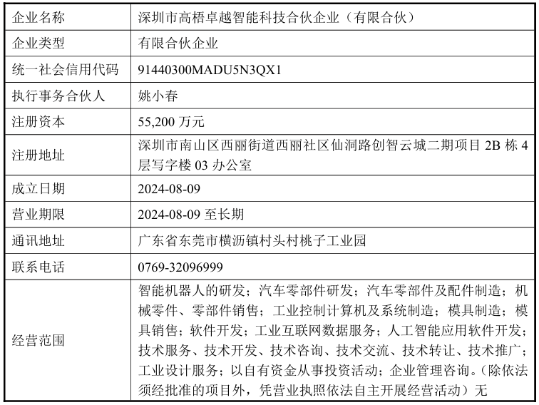 本次交易的收购方高梧卓越成立于2024年8月,成立至今无实质经营活动。注册资本5.52亿元,经营范围包括智能机器人的研发;汽车零部件研发;汽车零部件及配件制造;机械零件、零部件销售;工业控制计算机及系统制造;模具制造;模具销售;软件开发;工业互联网数据服务;人工智能应用软件开发等领域。