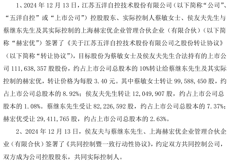 2024年12月,五洋自控曾披露公告,公司控股股东、实际控制人蔡敏女士、侯友夫先生与蔡继东先生及其实际控制的上海赫宏优企业管理合伙企业(有限合伙)签署了《关于江苏五洋自控技术股份有限公司之股份转让协议》,目标股份为蔡敏女士及侯友夫先生合法持有的上市公司111,638,357股股份,约占上市公司总股本的10%转让给蔡继东先生及其实际控制的赫宏优,转让价格为每股3.40元。其中蔡敏女士转让99,588,450股,约占上市公司总股本的8.92%;侯友夫先生转让12,049,907股,约占上市公司总股本的1.08%。蔡继东先生受让82,226,592股,约占上市公司总股本的7.37%;赫宏优受让29,411,765股,约占上市公司总股本的2.63%。