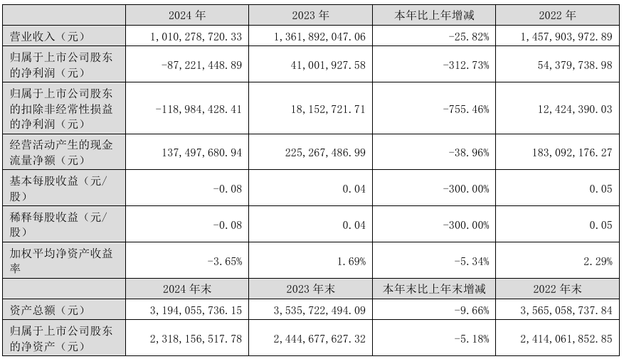 年报显示,公司近三年营业收入、净利润持续下滑。2022年度-2024年度,公司营业收入分别为14.58亿元、13.62亿元、10.10亿元;归母净利润分别为5,437.97万元、4,100.19万元、-8,722.14万元。