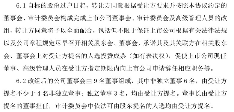 此外,标的股份过户后,五洋自控将进行董事会改组,改组后的公司董事会由9名董事组成,其中非独立董事6名,由高梧卓越提名不少于4名非独立董事;独立董事3名,均由高梧卓越提名。董事长由高梧卓越提名的董事担任,审计委员会中依法可由股东提名的人选均由高梧卓越提名。