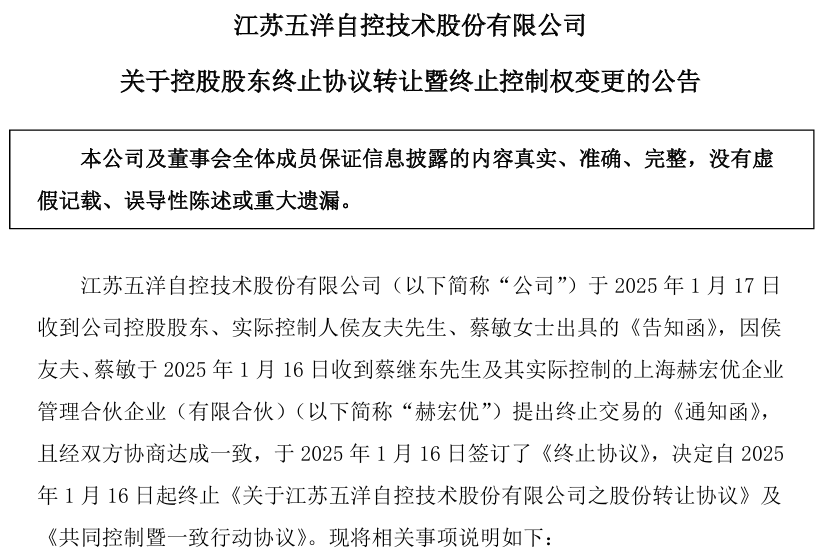 但一个月后,公司披露公告,因侯友夫、蔡敏于2025年1月16日收到蔡继东先生及其实际控制的上海赫宏优企业管理合伙企业(有限合伙)提出终止交易的《通知函》,且经双方协商达成一致,于2025年1月16日签订了《终止协议》,决定自2025年1月16日起终止《关于江苏五洋自控技术股份有限公司之股份转让协议》及《共同控制暨一致行动协议》。
