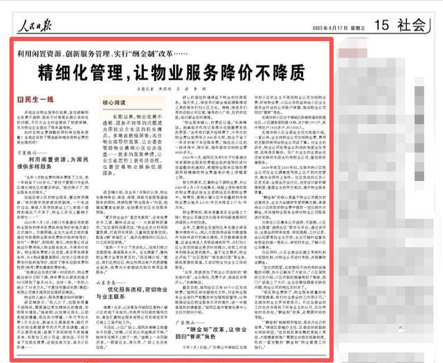 2025年9月17日,(第 15 版 社会)再次将目光投向物业领域,但这次不再是单纯的痛斥物业乱象--而是呈现了多个城市的成功实践。从银川的精细化管理到佛山的酬金制改革,这些案例揭示了一个朴素却深刻的道理:没有服务不好的小区,只有不尽心的服务。